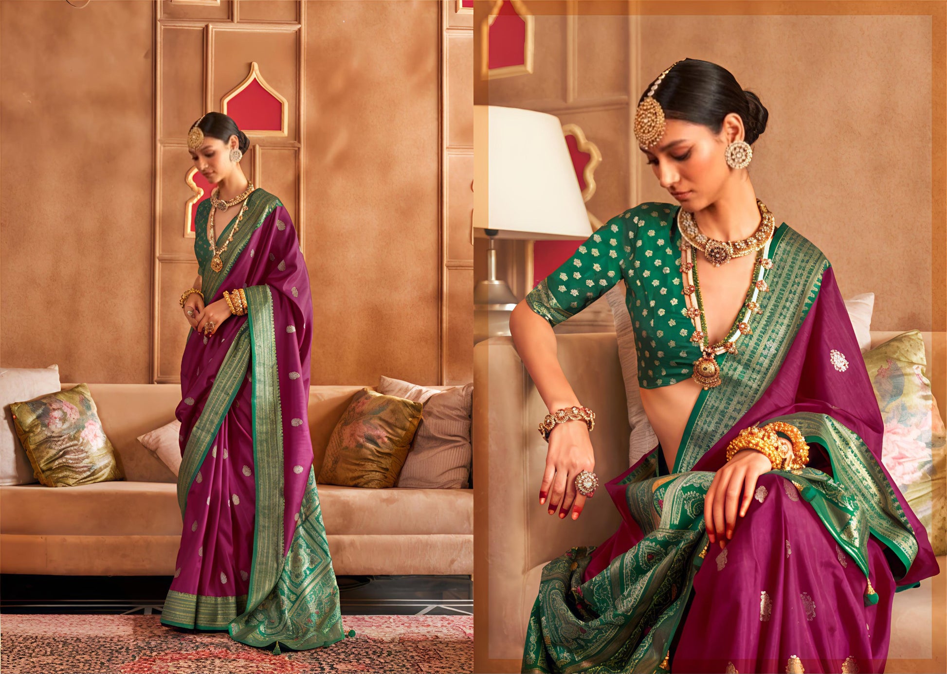 • Crafted from rich Banarasi silk, these Patola showcase a classic blend of intricate Zari weaving, vibrant colors, and cultural motifs.