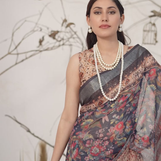 FABRIC: Premium Linen Cotton Saree with Elegant Digital Floral & Royal Ethnic Print & Classic Contrast Patola Style Border (5.5 Mtr Saree)