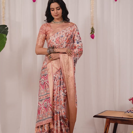 FABRIC: Premium Soft Lichi Silk Saree adorned with intricate floral digital weaving and luxurious golden zari border — blending timeless charm with regal grace.