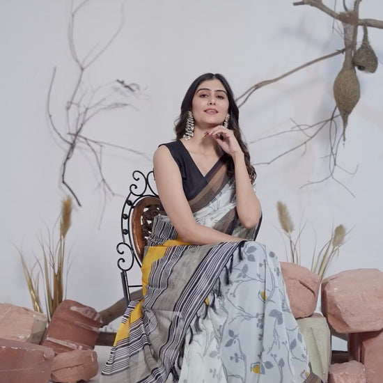 FABRIC: Soft Georgette Lightweight Saree with Delicate Cream Base, Adorned with Subtle Bird & Branch Motifs and Finished with Bold Mustard-Yellow & Black Striped Digital Print Border and Pallu with Elegant Tassel Detailing (5.5 Mtr Saree)