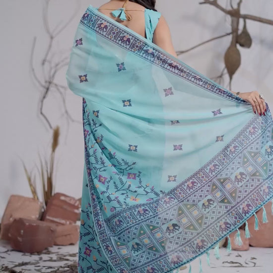 FABRIC: Soft Georgette Saree in Refreshing Sea Green Tone Highlighted with Intricate Digital Tribal & Floral Print, Featuring Artistic Elephant & Geometric Motifs with Elegant Tassel Detailing on Pallu (5.5 Mtr Saree)