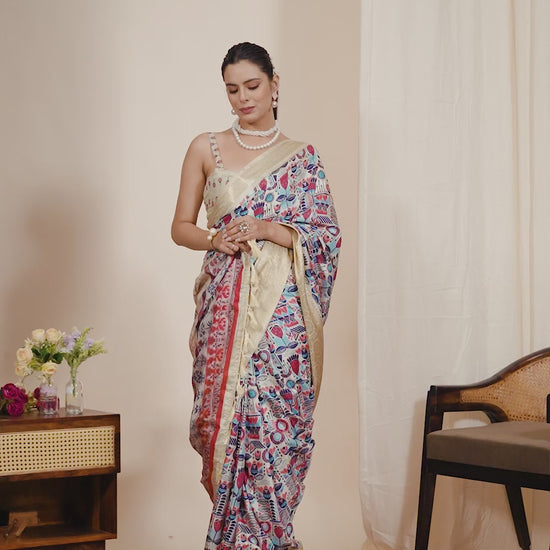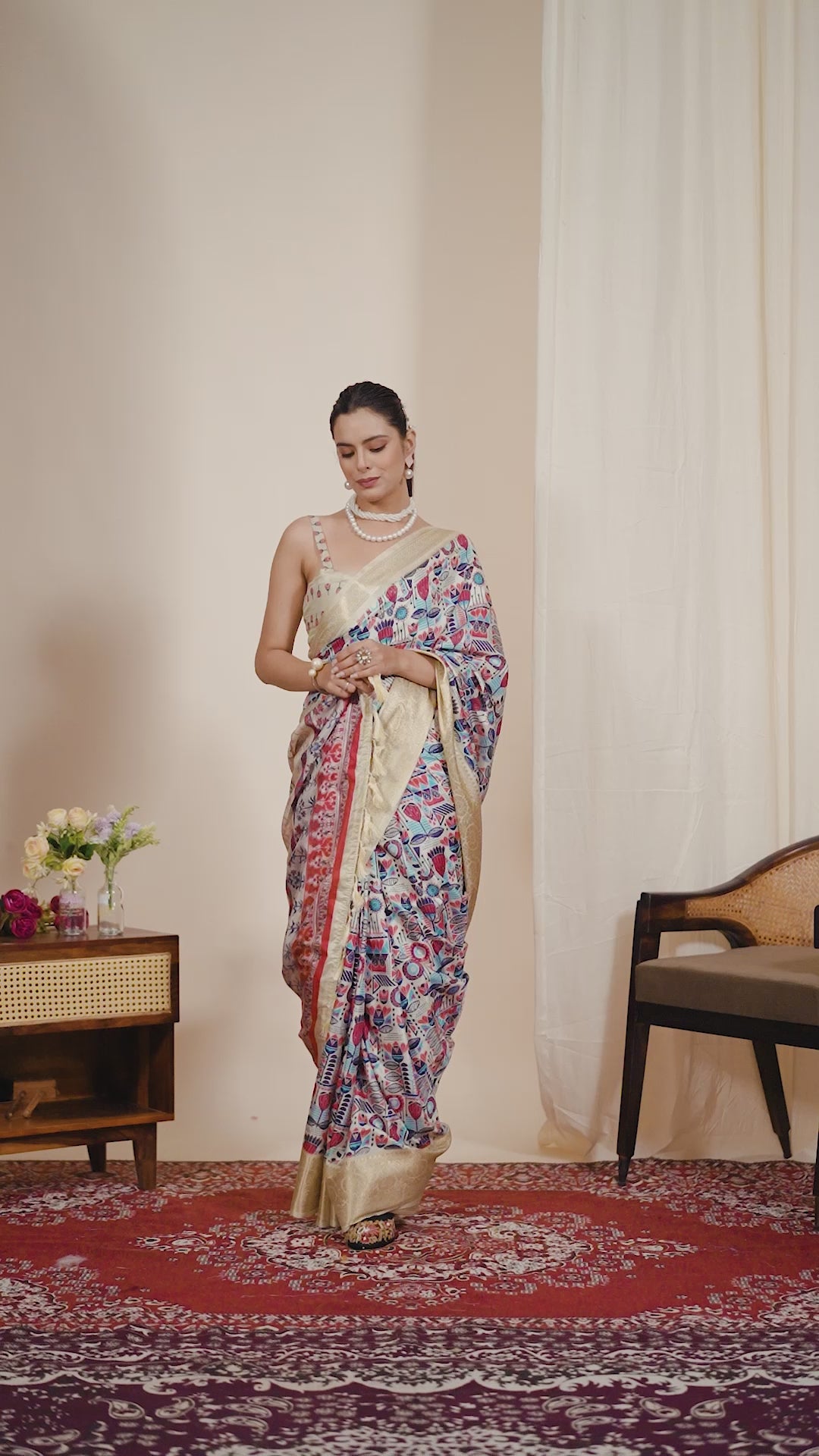 FABRIC: Exquisite Soft Lichi Silk Saree enriched with artistic multicolor digital weaving and a grand golden zari border — an epitome of elegance and festive luxury.