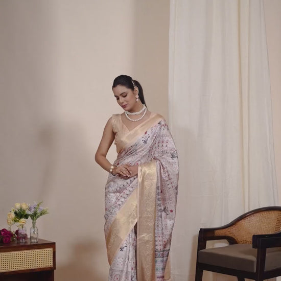 FABRIC: Soft Lichi Silk Saree adorned with graceful ethnic digital prints and complemented by a luxurious golden zari woven border. The elegant beige-golden tone adds a royal charm, perfect for festive and traditional occasions.