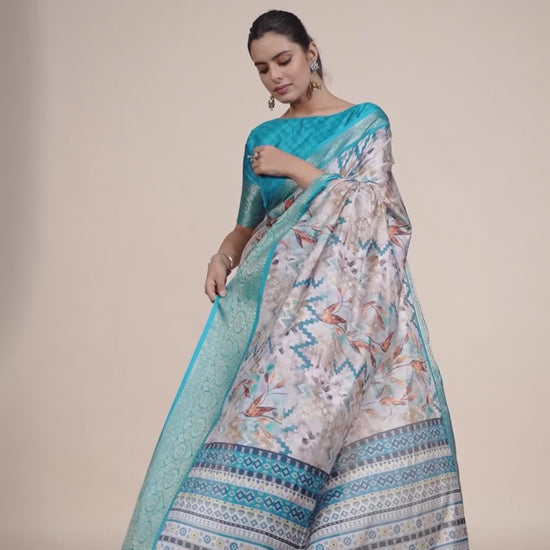 FABRIC: Soft Lichi Silk Saree featuring an Exquisite Combination of Modern Digital Print and Rich Traditional Zari Woven Border. The soothing aqua tone paired with delicate patterns brings out a royal yet refreshing festive appeal.