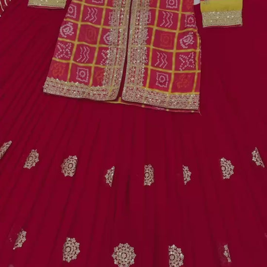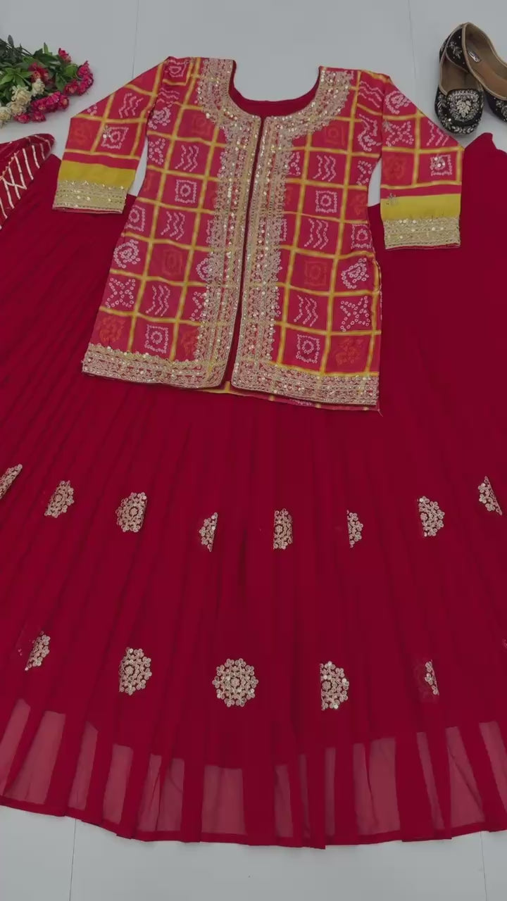 RED DESIGNER WEAR HEAVY CHINON EMBROIDERY CODING SEQUENCE WORK TOP WITH LEHENGA