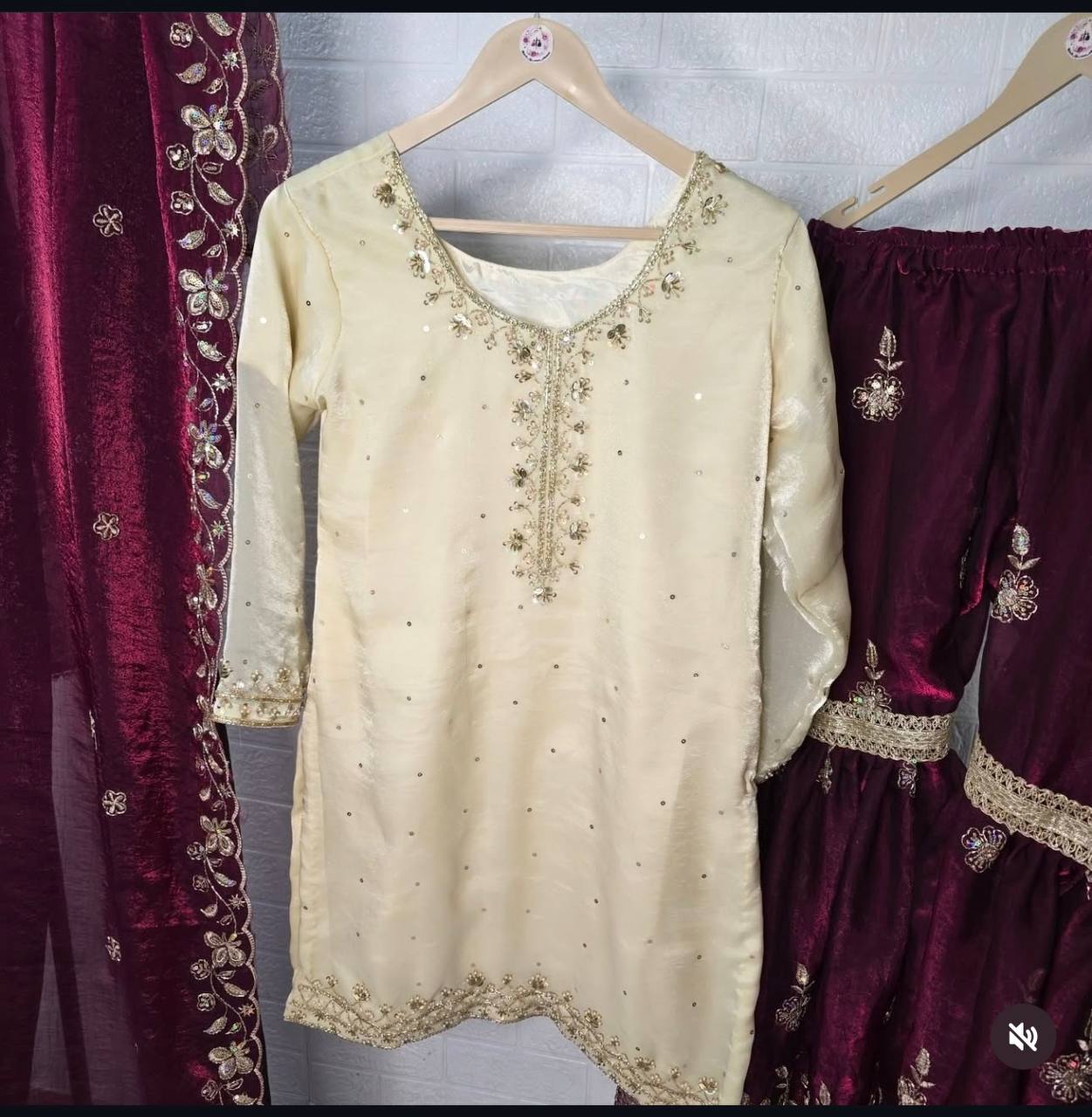 Wine Rose Zmy Silk Embroidered Party Sharara Suit Set with Dupatta